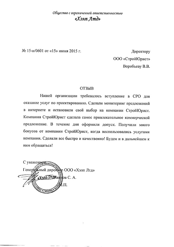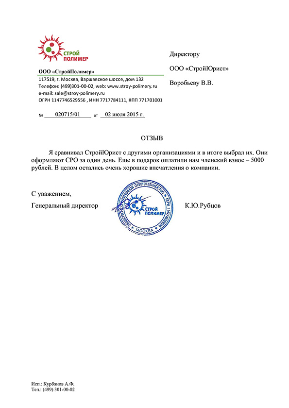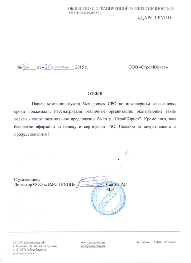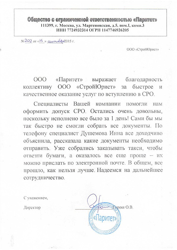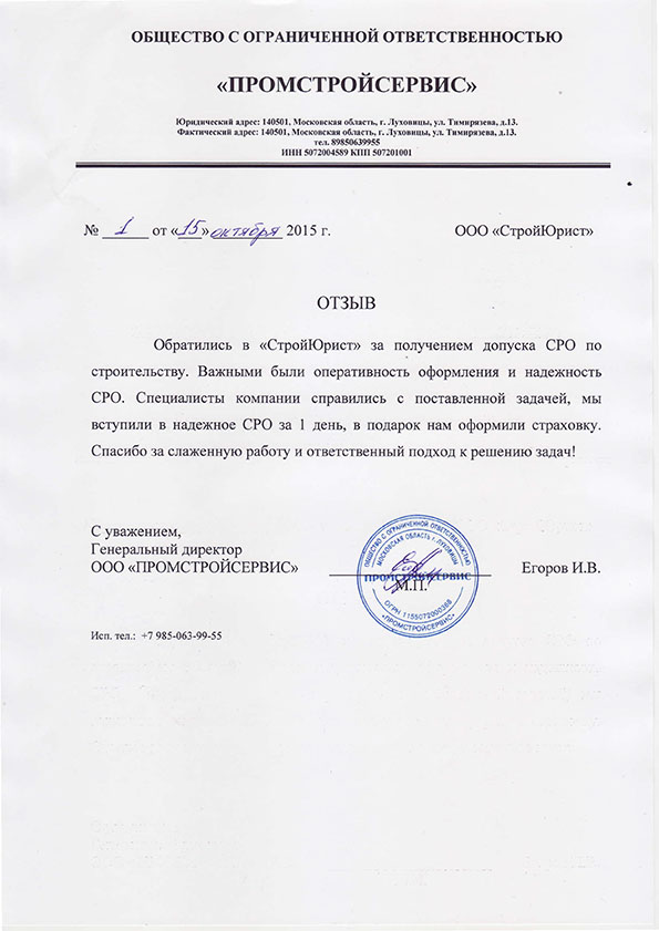 Отзывы клиентов "СтройЮрист" по вступлению в СРО в Красногорске